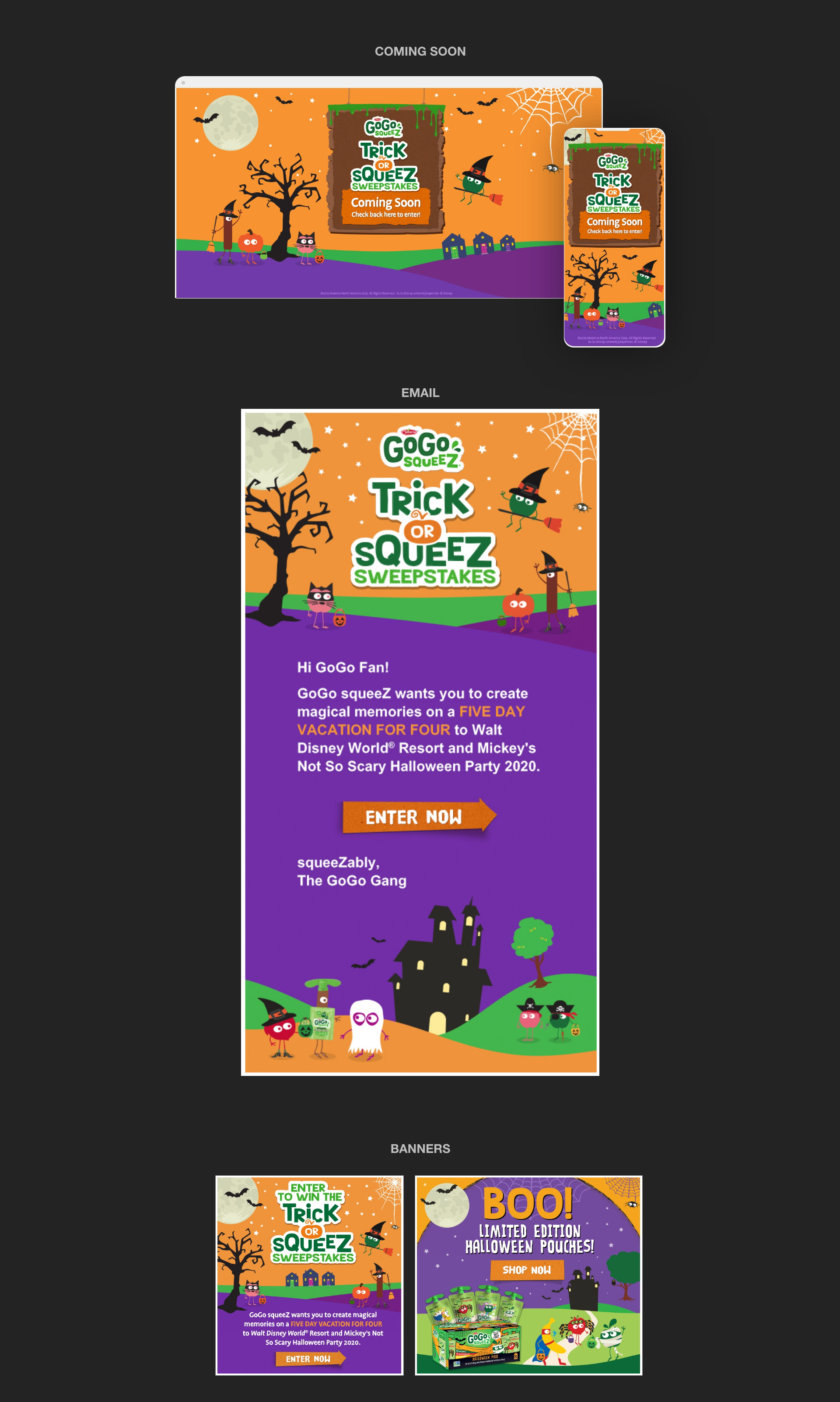 GoGo squeeZ partnered with Walt Disney World Resort for a 'Trick or squeeZ Sweepstakes' promotion to encourage families to offer healthier snacks to kids on Halloween. I designed this ViralSweep microsite, which included incorporating the GoGo characters in a Halloween theme as a tie-in for this promotion.