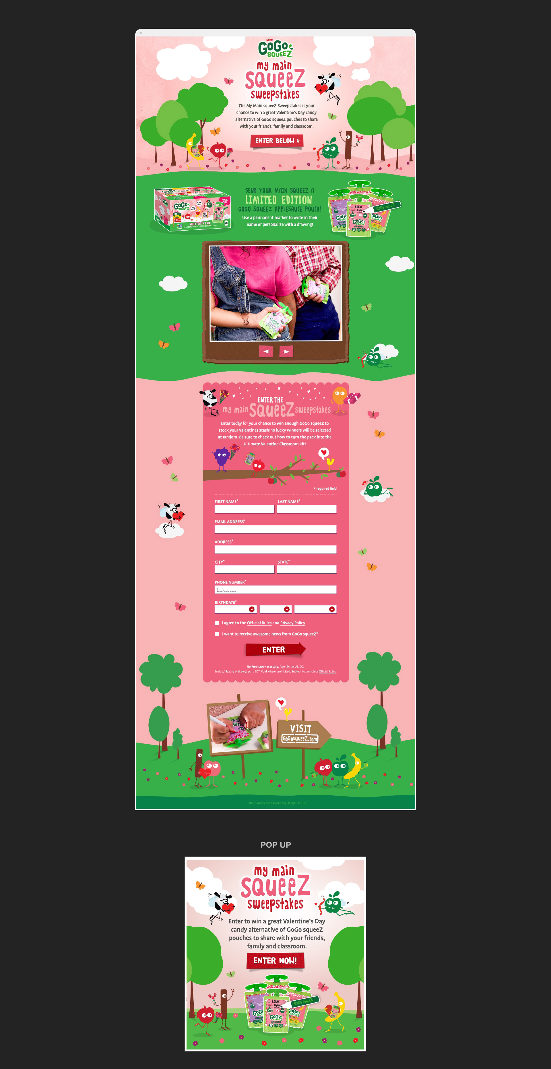 GoGo squeeZ 'My Main squeeZ Sweepstakes' promotion encourages families to offer healthier snacks to kids on Valentine's Day. I designed this ViralSweep microsite, which included incorporating the GoGo characters in a Valentine's Day theme as a tie-in for this promotion.