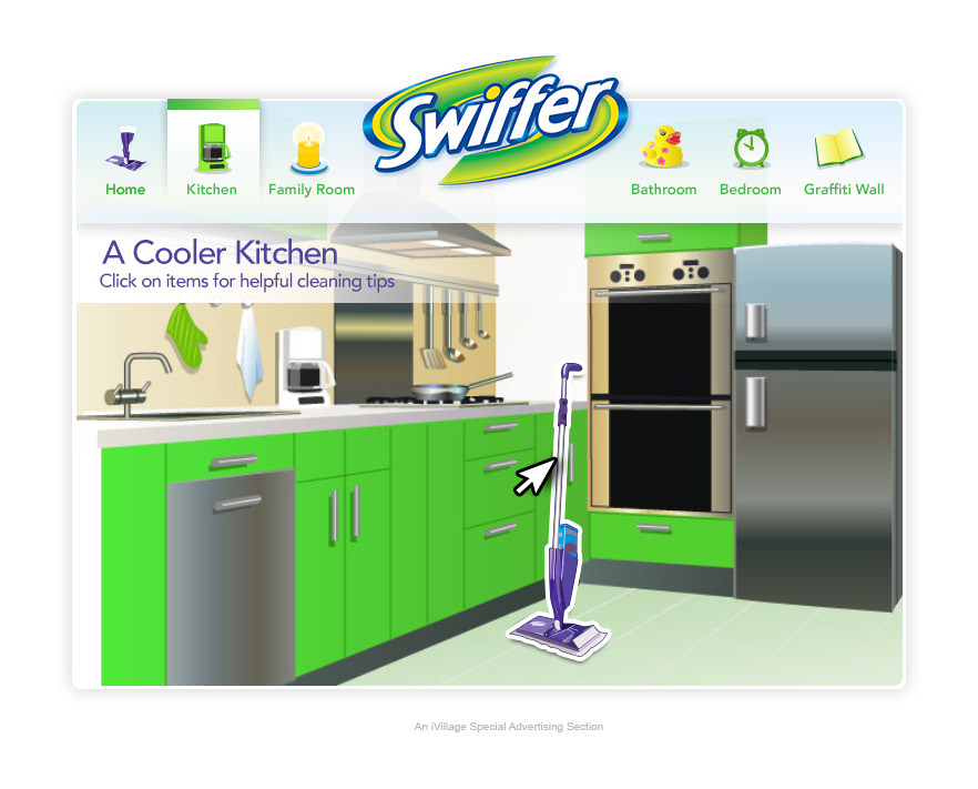 This special advertising section provided by iVillage was to educate consumers that the Sweeper does both dry sweeping and wet mopping. The microsite offered a fun, light-hearted interactive experience along with a 'message board' (graffiti wall) to share their tips and stories about simplifying life. I was responsible for the design and provided creative direction to an illustrator to create the various rooms.